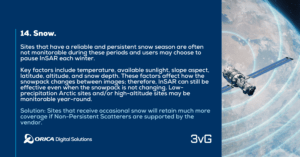 Sites that have a reliable and persistent snow season are often not monitorable during these periods and users may choose to pause InSAR each winter.