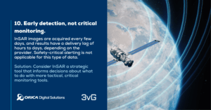 InSAR images are acquired every few days, and results have a delivery lag of hours to days, depending on the provider. Safety-critical alerting is not applicable for this type of data.