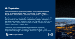 Use cases for L-band: closed vegetated sites, forested geohazards that could threaten site access, and very fast displacement (longer wavelength data has a higher speed limit).