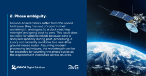 Ground-based radars suffer from this speed limit issue; they ‘run out of room’ in their wavelength, analogous to a clock reaching midnight and going back to zero. This issue does not exist for satellite InSAR because data is analysed spatially during post-processing; a luxury not currently available to a real-time ground-based radar. Assuming modern processing techniques (see also 8), the wavelength can be far exceeded by counting the phase cycles as the displacement intensifies across an area.