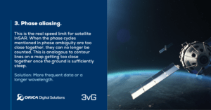 This is the real speed limit for satellite InSAR. When the phase cycles mentioned above are too close together, they can no longer be counted. This is analogous to contour lines on a map getting too close together once the ground is sufficiently steep.