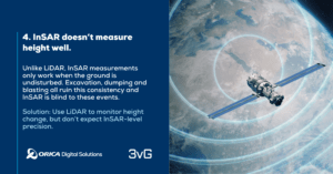 Unlike LiDAR, InSAR measurements only work when the ground is undisturbed. Excavation, dumping and blasting all ruin this consistency and InSAR is blind to these events.
