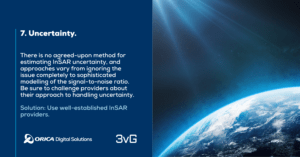 There is no agreed-upon method for estimating InSAR uncertainty, and approaches vary from ignoring the issue completely to sophisticated modelling of the signal-to-noise ratio. Be sure to challenge providers about their approach to handling uncertainty.